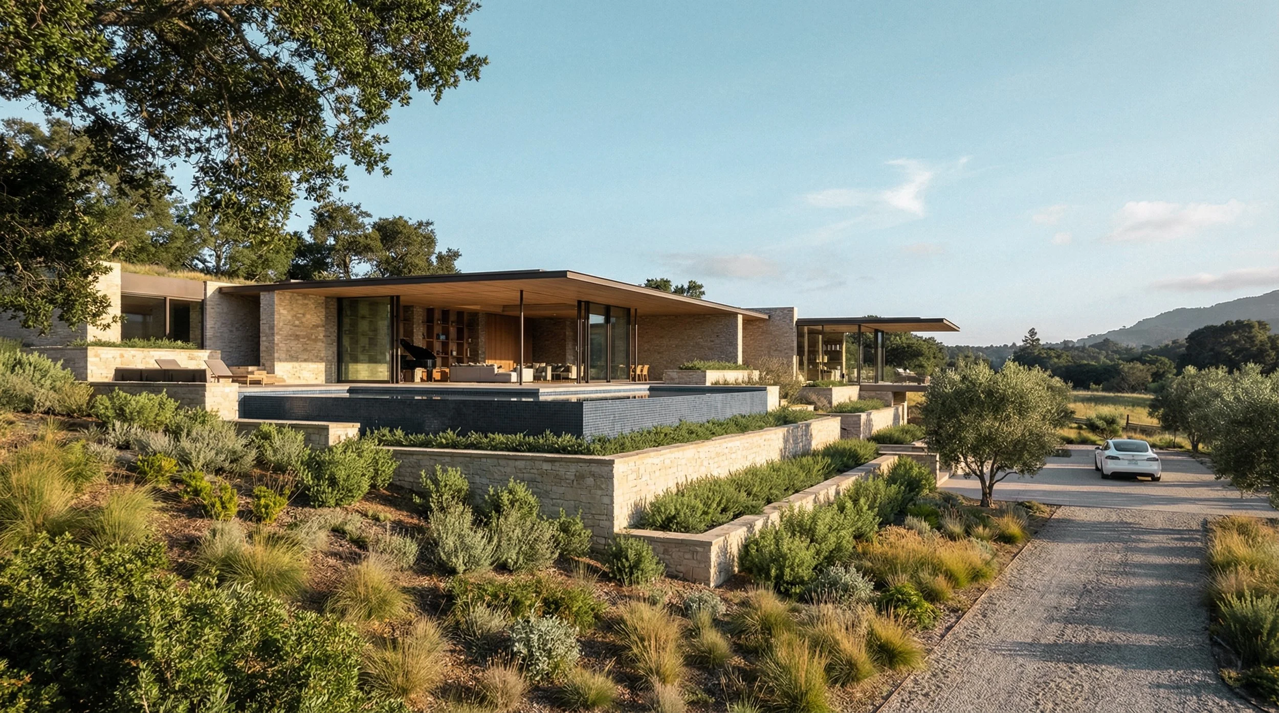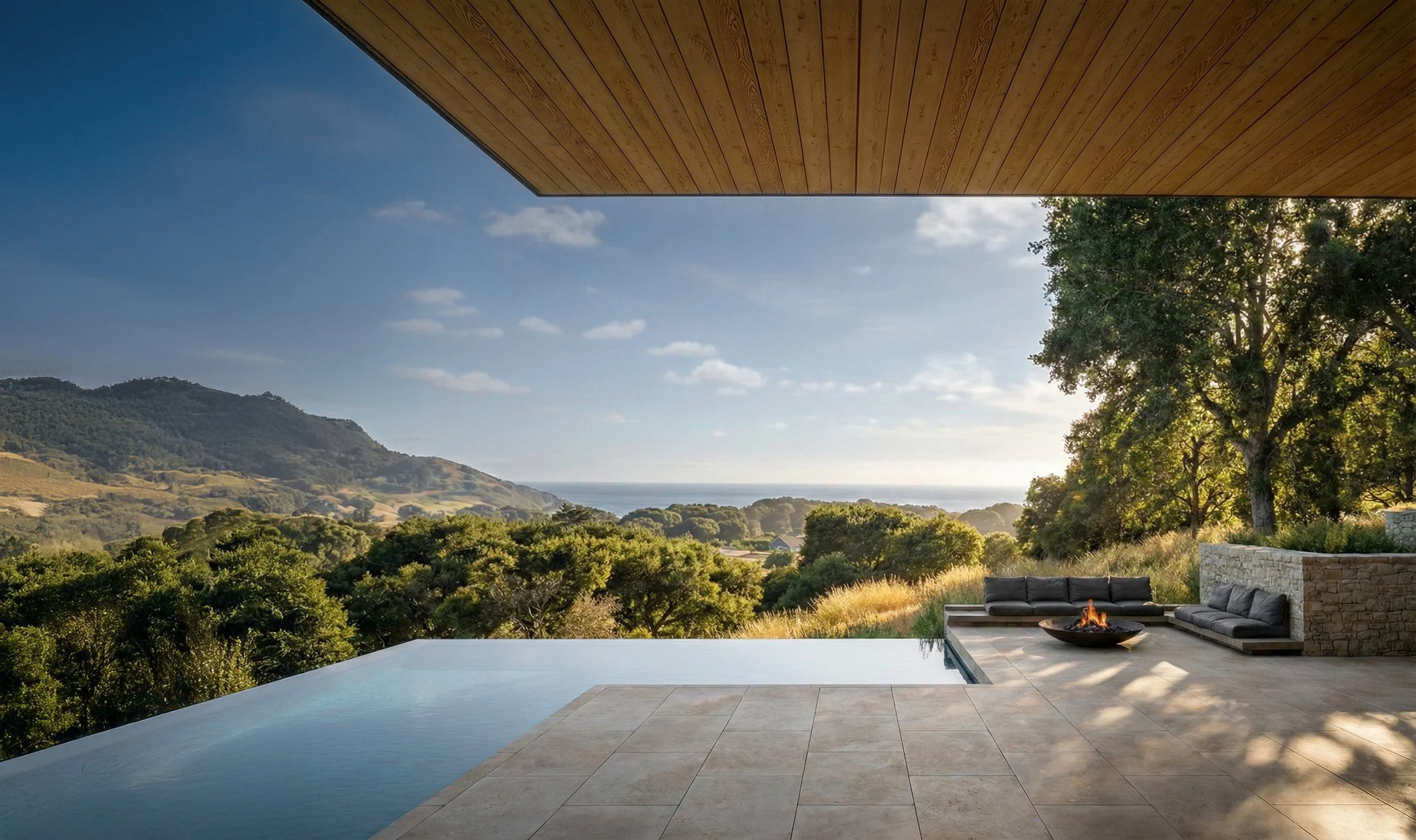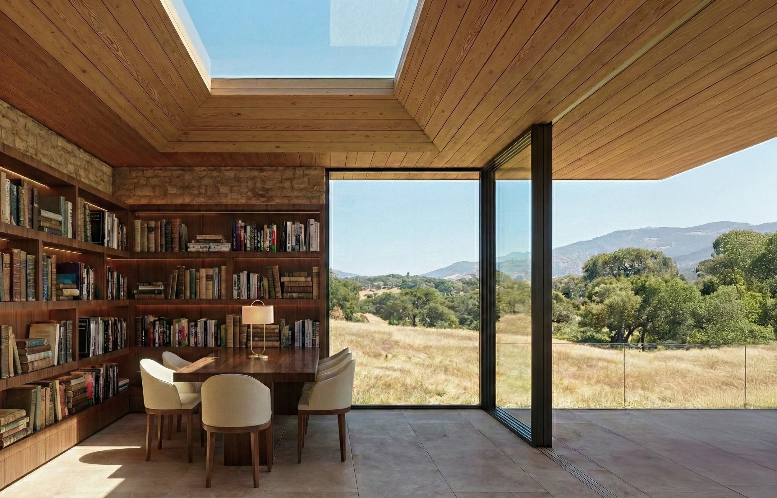 ONE WITH NATURE  Whether inside or outside you feel completely immersed in the landscape, hearing the rustle of sea breezes through the surrounding oaks, smelling the fresh coastal air, feeling the natural materials of the site beneath your feet, and looking out at the romantic backdrop of the mountains embracing the valley. The design establishes a profound connection with the land through the use of walls of locally sourced stone forming terraced landscapes which facilitate a seamless indoor/outdoor living experience. Cantilevered roofs offer both shade and protection from the elements. Expansive glass sliding doors with minimal frames open onto terraces ensuring that each room maintains sweeping vistas of Carmel Valley.
