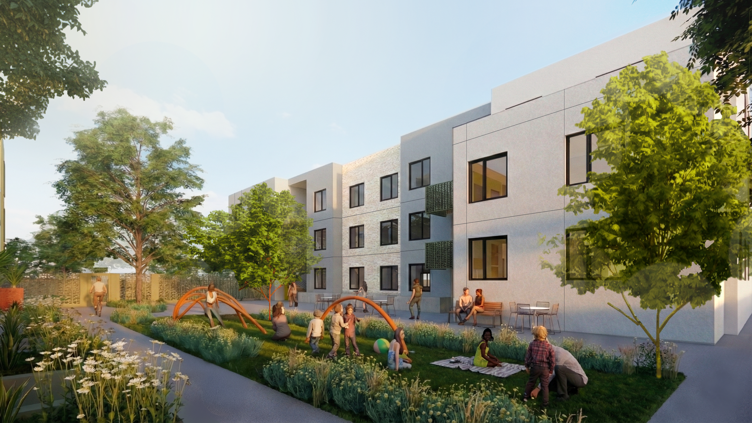 CONNECTING NEIGHBORHOODS  The design of this affordable housing project is driven by the concept of stitching together a site which currently sits disconnected from the rest of the neighborhood. This constrained site has no street frontage and is surrounded by single family homes.